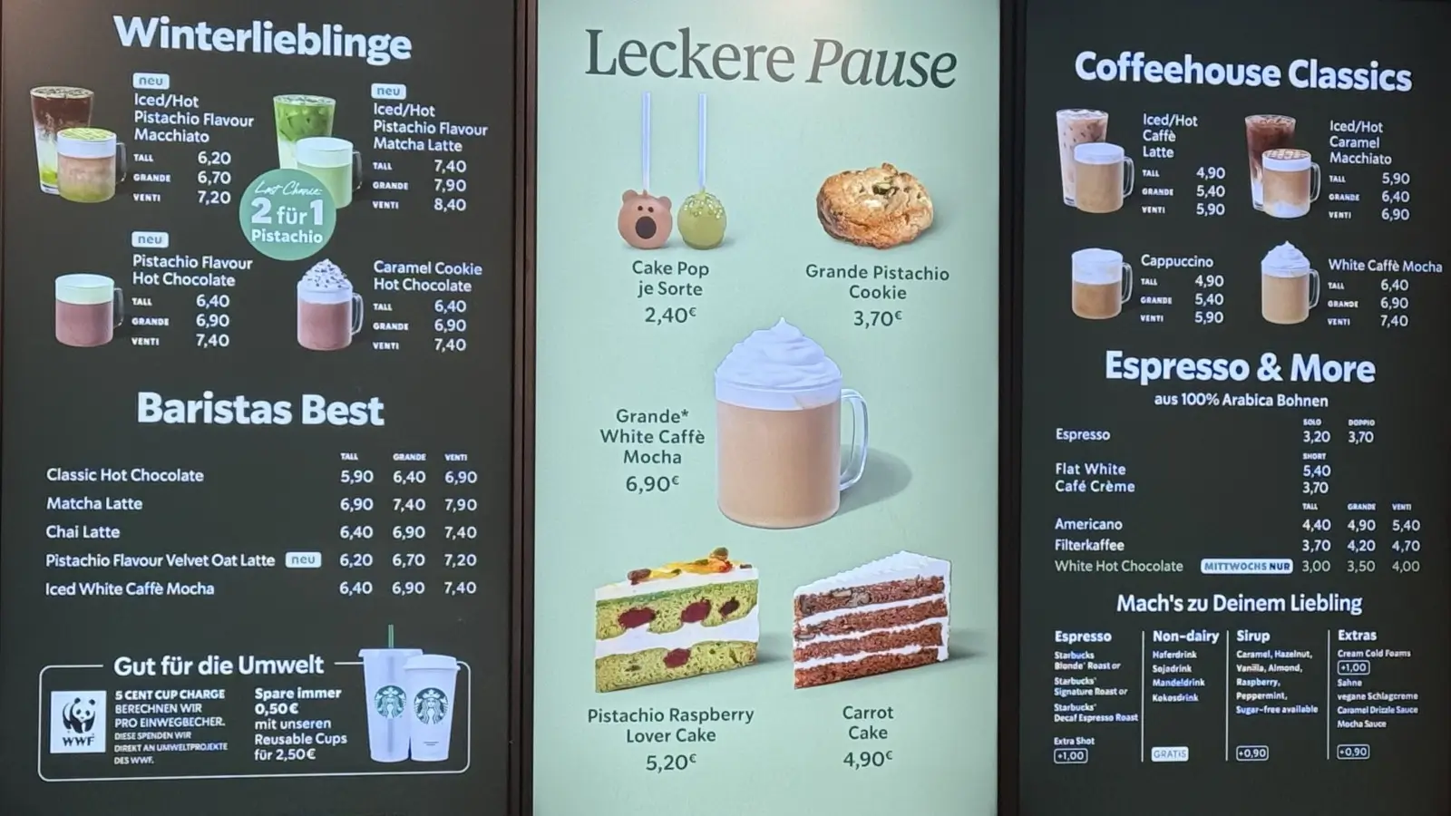 Die Starbucks Preise in Deutschland liegen zwischen 1,20 € bis 8,50 €. Durchschnittlich zahlt man 6,40 € für ein Getränk und 3,90 € für ein Essen. Ein normaler Kaffee startet bei 3,20 €, während besondere Getränke wie Iced Espresso Drinks und Frappuccino Blended Beverages bis zu 8,50 € kosten. Daneben gibt es Matcha-Getränke, Cold Brews, Macchiato, Cappuccino, Espresso, Tee, Bubble-Teas und Milchgetränke.